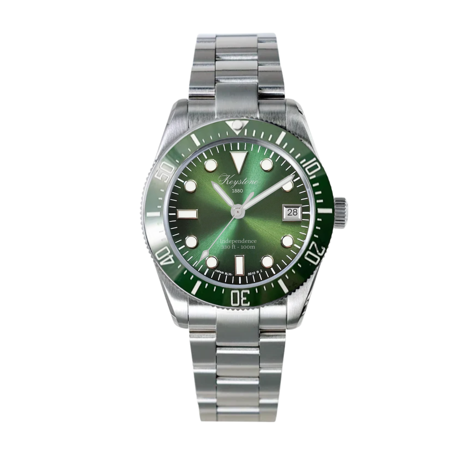 The Independence Diver in Hunter Green features a striking fume black dial houses a Japanese NH35 movement in 316L stainless steel. Its sapphire crystal offers exceptional scratch resistance, while the watch’s 100m (330 ft) water resistance ensures reliable performance for everyday wear and aquatic activities. Designed with precision and resilience, this timepiece balances elegance with practicality for the discerning enthusiast.